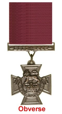 Obverse: A Maltese cross on which is the Royal Crown surmounted by a lion. The sides and bottom of these are surrounded by a scroll on which is the legend "FOR VALOUR".