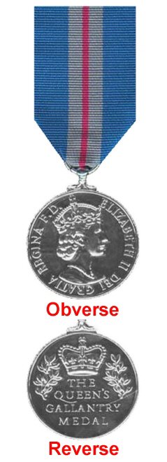 Reverse: The words "THE QUEEN'S GALLANTRY MEDAL". This is surmounted by a crown, either side of which is a laurel leaf.