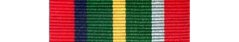 Ribbon: 32mm wide. The ribbon is dark green with 6mm red edges, a 3mm central yellow stripe, and two 3mm stripes, one dark blue and the other light blue, inside the red edges. The dark blue stripe should be worn farthest from the left shoulder, i.e. to the left when facing the wearer. The green and yellow symbolise the forests and the beaches; the dark blue represents the Navy, the red the Army, and the light blue the Air Force.