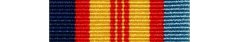 Ribbon: 32mm wide. A yellow ribbon bordered on the left with a dark blue strip, representing the Navy and on the right a light blue strip, representing the Air Force, both being one quarter of an inch wide and edged on the inner side with strips of red, representing the Army, each one eighth of an inch wide. Within a space of one sixth of an inch in the centre of the ribbon, three vertical stripes in red of a lighter hue, each of equal width are super-imposed on the yellow, the distance between each stripe being equal to the width of the stripe.