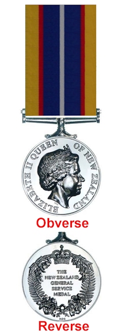 Reverse: The inscription "THE NEW ZEALAND GENERAL SERVICE MEDAL" within a wreath of New Zealand flora (fern fronds, pohutukawa, and kowhai blossom) ensigned by a Royal Crown.