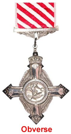 Obverse: A thunderbolt in the form of a cross, the arms conjoined by wings, the base bar terminating with a bomb surmounted by another cross composed of aeroplane propellers, the four ends enscribed with the letters G.V.R.I. In the centre a roundel, thereon a representation of Hermes mounted on a hawk in flight bestowing a wreath. The whole ensigned by an Imperial Crown and attached to the clasp and ribbon by two sprigs of laurel.
