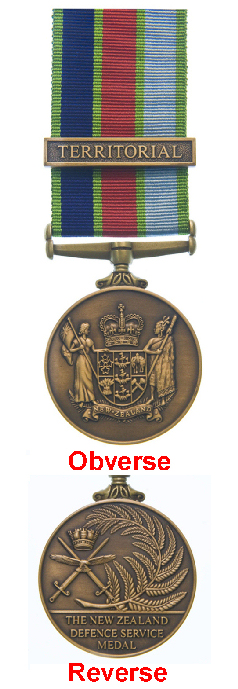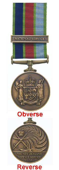 Reverse: A representation of a New Zealand fern frond, in the right field, and to the left, 2 swords in saltire, points upward, with a Naval Crown between, and in the centre an eagle, volant affronte, the head lowered and to the sinister; and in the exergue the inscription "THE NEW ZEALAND DEFENCE SERVICE MEDAL".