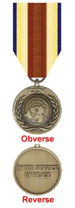 Ribbon: 35mm wide, the ribbon for this medal has a 14mm wide watered brown centre stripe and 2mm blue outer stripes. On each side of the brown centre stripe is an 8mm watered line which changes from white to yellow as it moves towards the outer edges. Sixty days of service in the Mission was necessary to qualify for award of the medal.