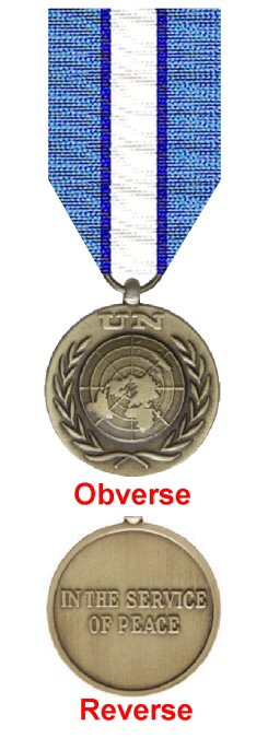 Ribbon: 35mm wide, the ribbon for this medal is blue with a 10mm white centre stripe. The centre stripe has a 1mm dark blue stripe on each side of it. Three months of service in the Mission was necessary to qualify for award of the medal.