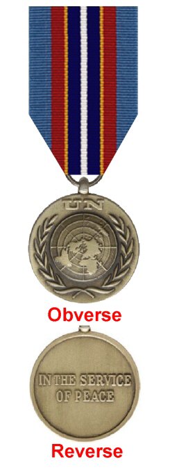 Ribbon: 35mm wide, the ribbon for this medal has 7mm light blue edges, inside of which are 4mm red stripes and 1mm yellow stripes. Inside of these is a 10mm dark blue stripe, in the centre of which is a 2mm white stripe. Ninety days of service in the Mission was necessary to qualify for award of the medal.