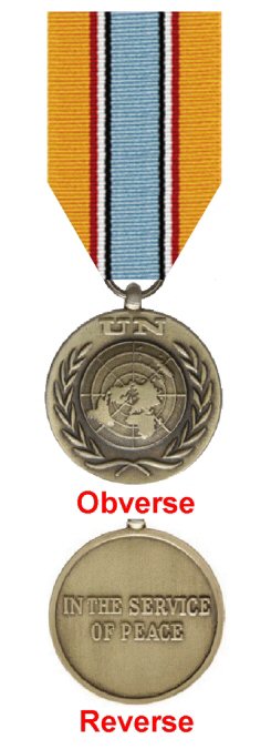 Ribbon: 35mm wide, the ribbon for this medal is light blue with 8mm yellow edges. Inside these edges are 1.5mm red and white stripes and a 1mm black stripe. Ninety days of service in the Mission was necessary to qualify for award of the medal.