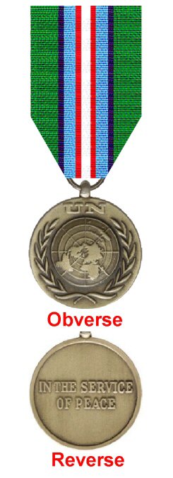 Ribbon: 35mm wide, the ribbon for this medal has 8mm green edges, inside of which are 1mm dark blue stripes, 4mm light blue stripes and 1mm red stripes. The centre of the ribbon is white. Ninety days of service in the Mission was necessary to qualify for award of the medal.