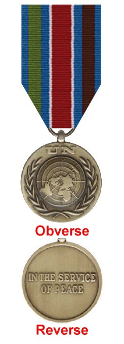 Ribbon: 35mm wide, the centre of the ribbon for this medal has a 9mm red stripe. Outside of this on either side is a 1mm white stripe and a 3mm light blue stripe. On each edge of the ribbon is a 3mm light blue stripe. Between the blue stripes on each side is, on the left of the ribbon a 6mm green stripe and on the right of the ribbon a 6mm brown stripe. Ninety days of service in the Mission was necessary to qualify for award of the medal.