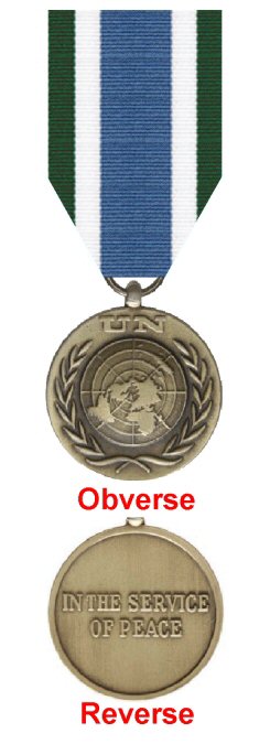 Ribbon: 35mm wide, the ribbon for this medal is light blue with 5mm green stripes at the edge, inside of which are 5mm white stripes. Ninety days of service in the Mission was necessary to qualify for award of the medal.