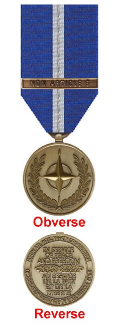 Ribbon: 35mm wide, the ribbon for this medal is dark blue, the colour of NATO, with a medium white stripe in the centre, in the centre of which is a narrow silver stripe. The clasp 'NON ARTICLE 5' is worn on the medal ribbon.