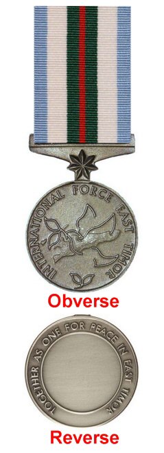 Obverse: The image of a dove holding within its beak an olive branch overlaying a map of East Timor. Around the edge the words "INTERNATIONAL FORCE EAST TIMOR".