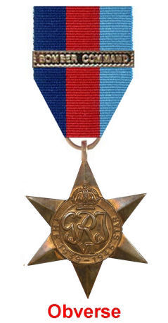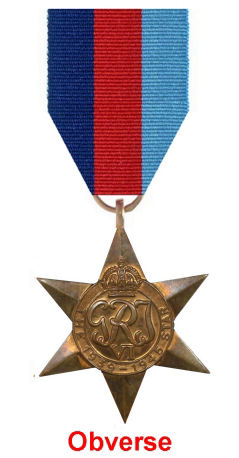 Obverse: A six pointed star, in the centre of which is the Royal Cypher surmounted by a crown superimposed on a circlet that bears the words "THE 1939-1945 STAR".