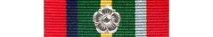 Ribbon: 32mm wide. The ribbon is dark green with 6mm red edges, a 3mm central yellow stripe, and two 3mm stripes, one dark blue and the other light blue, inside the red edges. The dark blue stripe should be worn farthest from the left shoulder, i.e. to the left when facing the wearer. The green and yellow symbolise the forests and the beaches; the dark blue represents the Navy, the red the Army, and the light blue the Air Force.