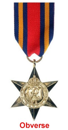 Obverse: A six pointed star, in the centre of which is the Royal Cypher surmounted by a crown superimposed on a circlet that bears the words "THE BURMA STAR".