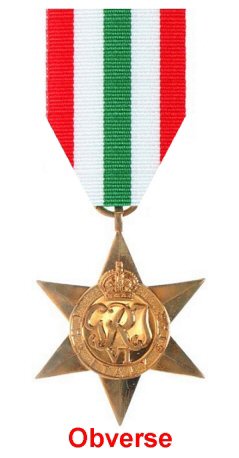 Obverse: A six pointed star, in the centre of which is the Royal Cypher surmounted by a crown superimposed on a circlet that bears the words "THE ITALY STAR".
