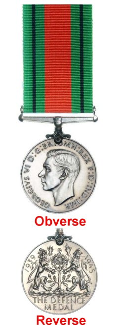 Reverse: The Royal Crown resting on the stump of an oak tree and flanked by two lions. On the top left is the date "1939" and on the top right the date "1945". At the bottom is the wording "THE DEFENCE MEDAL".