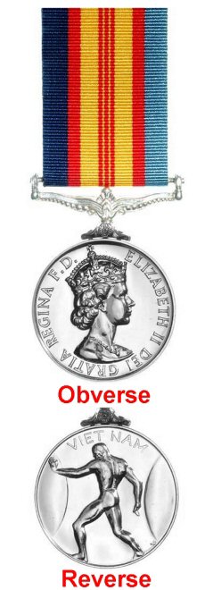 This cupro-nickel medal is an Australian issue and was awarded to the Australian and New Zealand Armed Forces serving in Vietnam after 29th May, 1964, for a minimum of twenty eight days' service in ships or one day ashore with an operational unit. Official visits had to last thirty days to qualify although service could be aggregated.