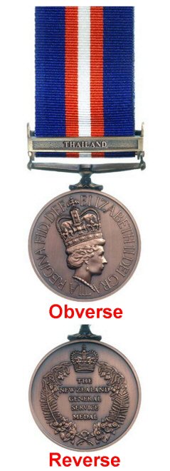 Reverse: The inscription "THE NEW ZEALAND GENERAL SERVICE MEDAL" within a wreath of New Zealand flora (Pohutukawa blossom, fern fronds, and kowhai blossom) ensigned by a Royal Crown.