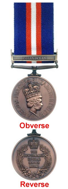 Reverse: The inscription "THE NEW ZEALAND GENERAL SERVICE MEDAL" within a wreath of New Zealand flora (Pohutukawa blossom, fern fronds, and kowhai blossom) ensigned by a Royal Crown.