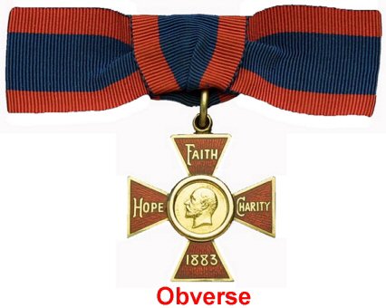 Obverse: A Maltese cross, the arms of which are joined to a circle at their inner end. Within the circle is an effigy of the head of the Sovereign. On the four arms of the cross, which are of red enamel, are the words "FAITH", "HOPE", "CHARITY" and the date "1883".