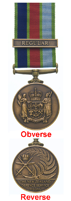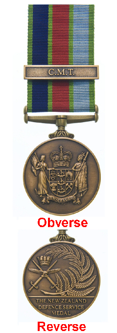 Reverse: A representation of a New Zealand fern frond, in the right field, and to the left, 2 swords in saltire, points upward, with a Naval Crown between, and in the centre an eagle, volant affronte, the head lowered and to the sinister; and in the exergue the inscription "THE NEW ZEALAND DEFENCE SERVICE MEDAL".