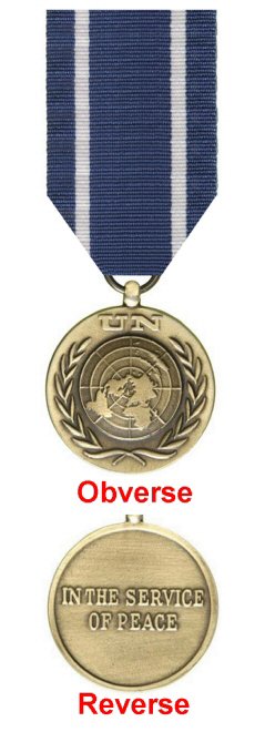 Ribbon: 35mm wide, the ribbon for this medal is blue with two 2.5mm white stripes, each 6mm from the edges. Six months of service in the Mission was necessary to qualify for award of the medal.