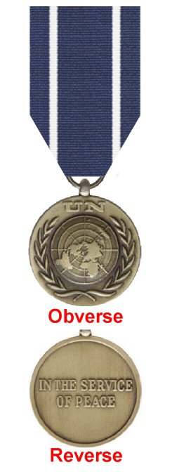 Ribbon: 35mm wide, the ribbon for this medal for this medal is blue with two 2.5mm white stripes, each 6mm from the edges. Six months of service in the Mission was necessary to qualify for award of the medal.