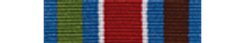 Ribbon: 35mm wide, the centre of the ribbon for this medal has a 9mm red stripe. Outside of this on either side is a 1mm white stripe and a 3mm light blue stripe. On each edge of the ribbon is a 3mm light blue stripe. Between the blue stripes on each side is, on the left of the ribbon a 6mm green stripe and on the right of the ribbon a 6mm brown stripe. Ninety days of service in the Mission was necessary to qualify for award of the medal.