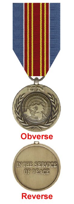 Ribbon: 35mm wide, the ribbon for this medal has the UN blue background, representing peace, upon which is a broad red field with yellow bands in the middle bordered by thin white bands, representing the UNPREDEP command presence in Macedonia. Ninety days of service in the Mission was necessary to qualify for award of the medal.