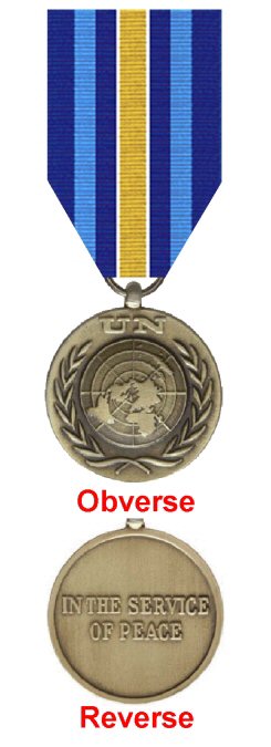 Ribbon: 35mm wide, the ribbon for this medal has a dark blue background which represents the waters of the Prevlaka peninsula. The yellow central stripe represents the sun that rises, promising a peaceful and prosperous future and is flanked by thin white stripes. These are followed on either side by a band of dark blue and UN blue representing peace. Ninety days of service in the Mission was necessary to qualify for award of the medal.