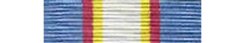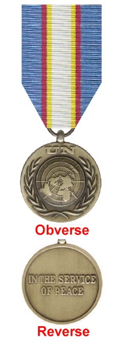 Ribbon: 35mm wide, the ribbon for all three medals is the same, and has two outer bands of UN blue, representing the UN presence in East Timor. Inside the two bands, there are two equal bars - closest to the blue, the bar is crimson, with the bar closest to the centre being sunrise yellow. These colours represent the brilliant and spectacular sunrises and sunsets experienced in East Timor. The centre of the ribbon is a band of white, traditionally the colour of peace and hope, the goal this Mission seeks to achieve. Ninety days of service in the Mission was necessary to qualify for award of the medal.